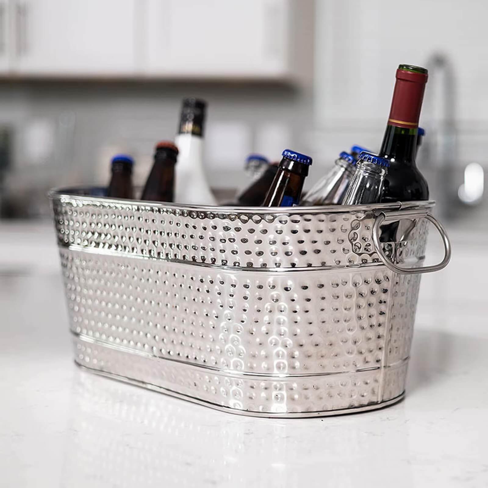Кулер изготовлен из прочного оцинкованного алюминия с декоративной фактурной поверхностью, которая придает изделию современный и элегантный внешний вид. Материал отличается легкостью, устойчивостью к коррозии и долговечностью, что делает кулер практичным для регулярного использования. Удобные боковые ручки обеспечивают комфортную переноску даже при полной загрузке льдом и напитками. Благодаря длине 45,5 см и высоте 19 см ведро вмещает большое количество бутылок, что делает его отличным решением для вечеринок, барбекю, ресторанов, баров и мероприятий на открытом воздухе.