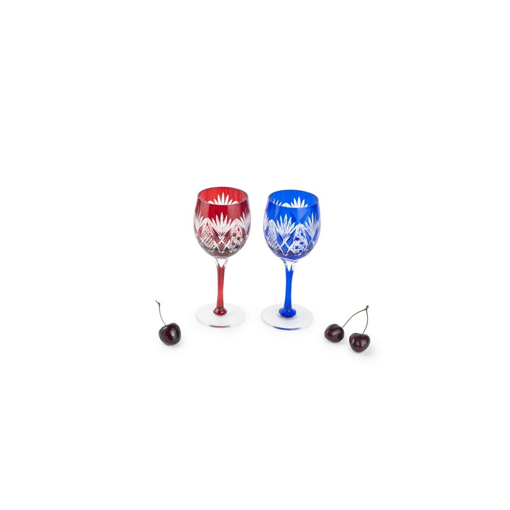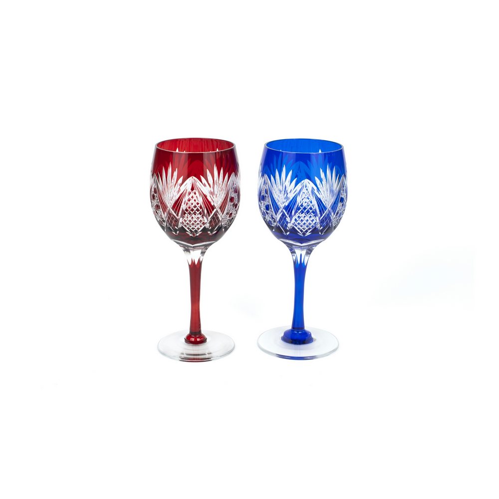 Элегантный набор из 2 фужеров с узором Хаккаку Кагомэ — традиционным японским мотивом «бамбуковая корзина с восьмиугольным плетением» — от мастерской Tajima Glass. Фужеры на ножках выполнены в красном и лазурном (рури иро) цветах, ярком и глубокого тона, символизирующем успех, власть и благородство. Лазуритовый оттенок традиционно ценился в Японии и был доступен лишь императору и аристократии.