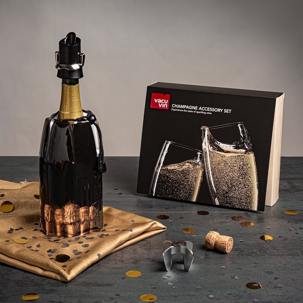 Все аксессуары разработаны специально с учётом всех особенностей формы бутылки шампанского — охлаждающий чехол оснащён утягивающей кулиской для максимального прилегания чехла к стенкам сосуда, открывалка подходит к большинству пробок, а практичная пробка с рычагом надёжно защитит напиток от попадания в бутылку воздуха.